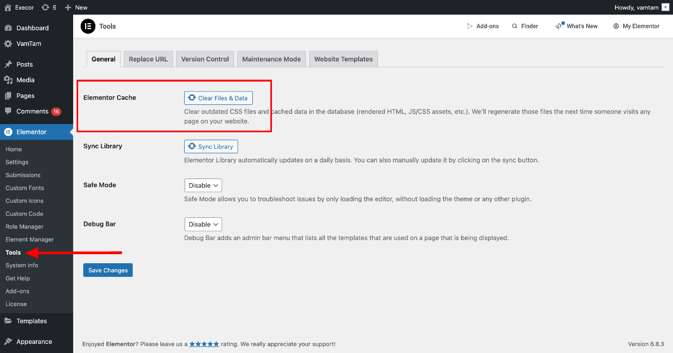 Then, go to Elementor > Tools > General and click the "Elementor Cache" button: