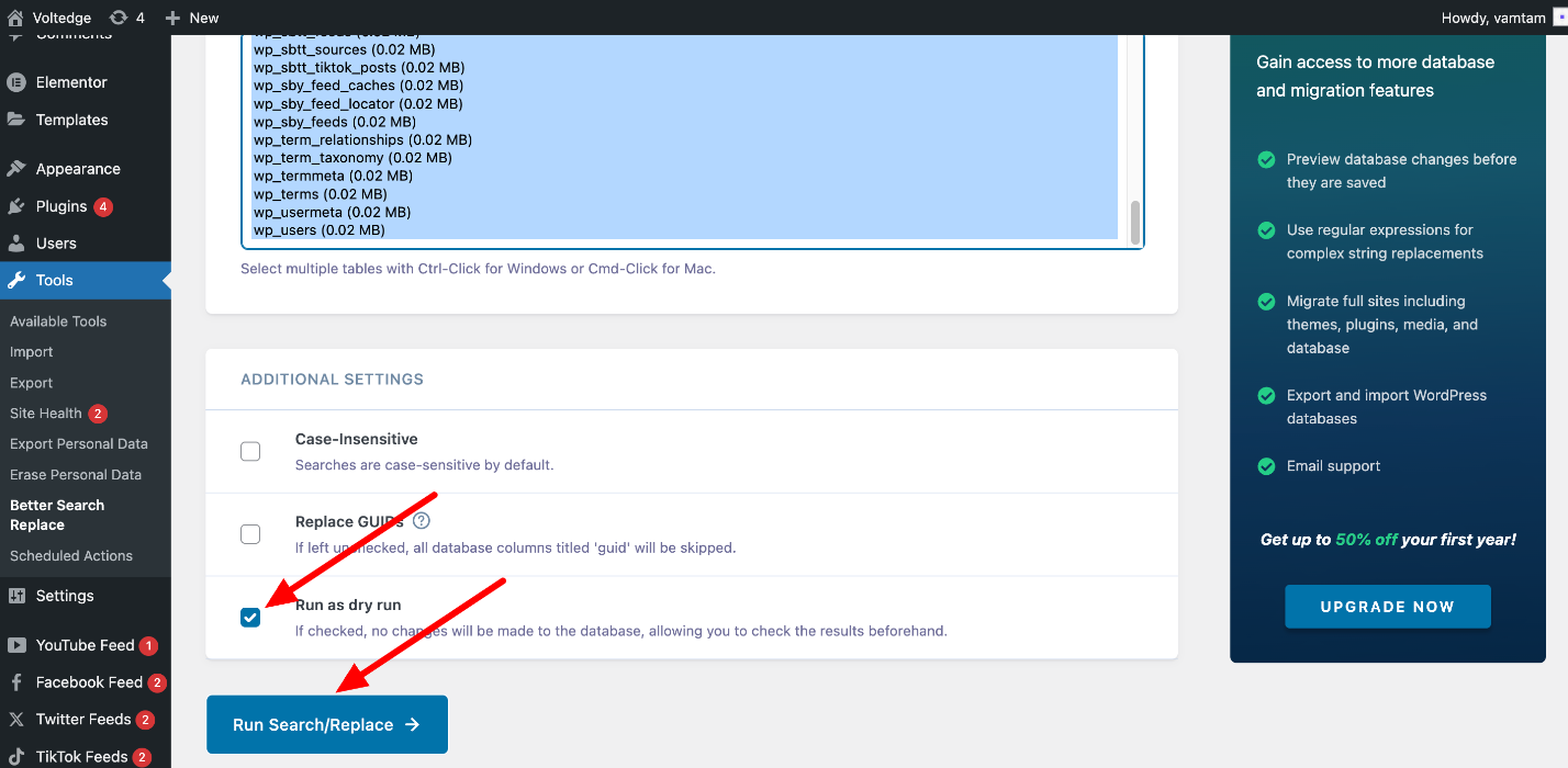 Uncheck this option, so the plugin could make the necessary changes. Click the "Run Search/Replace" button: