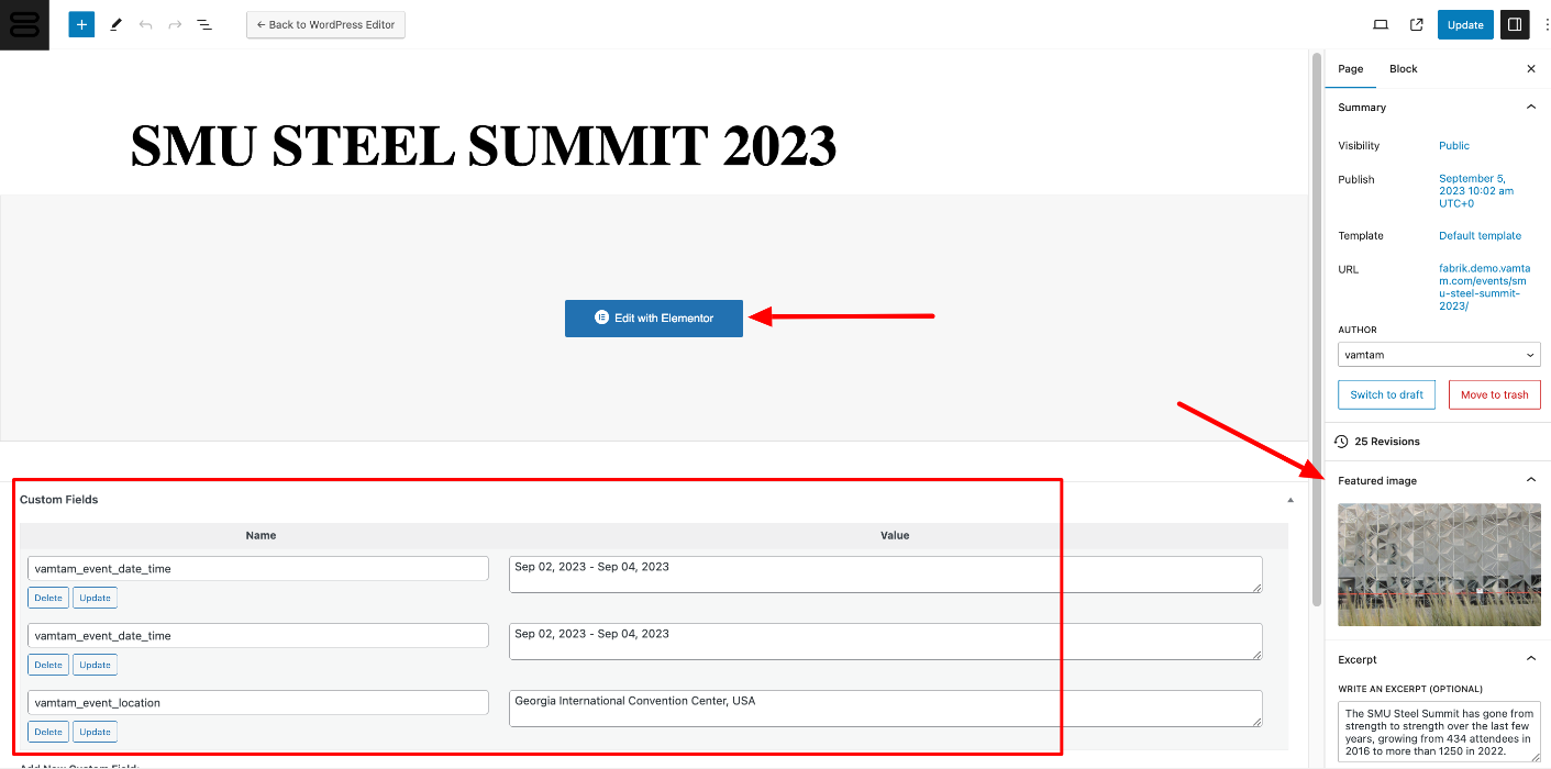 Edit the "Title", "Excerpt", "Featured image" and the page's Custom Fields (the Date and Location of the event).