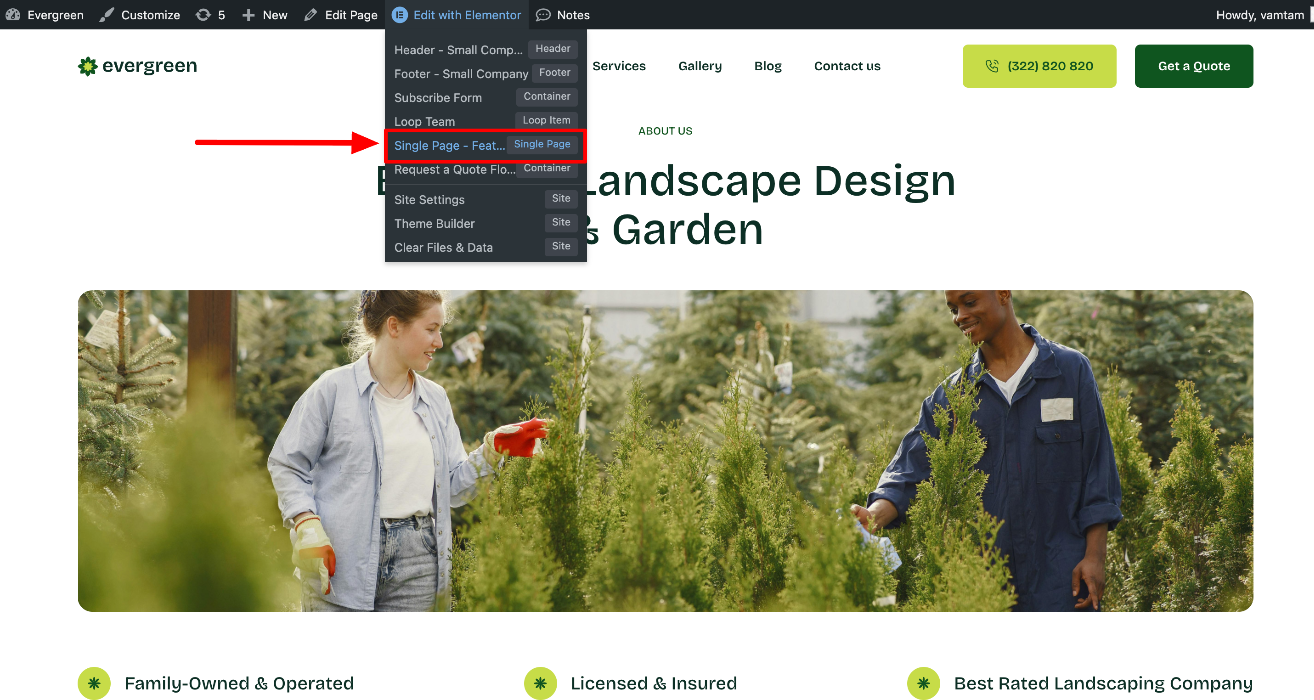 To begin, navigate to the Toolbar > Edit with Elementor > click on the Single Page template (the name may vary):