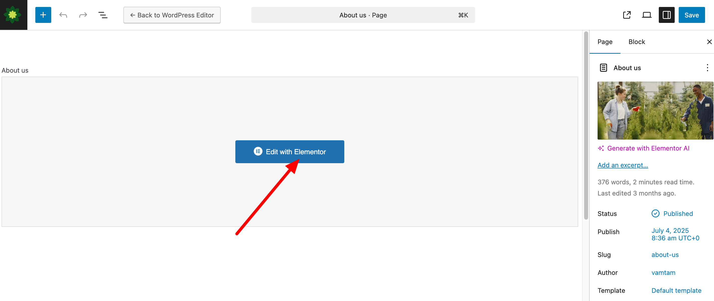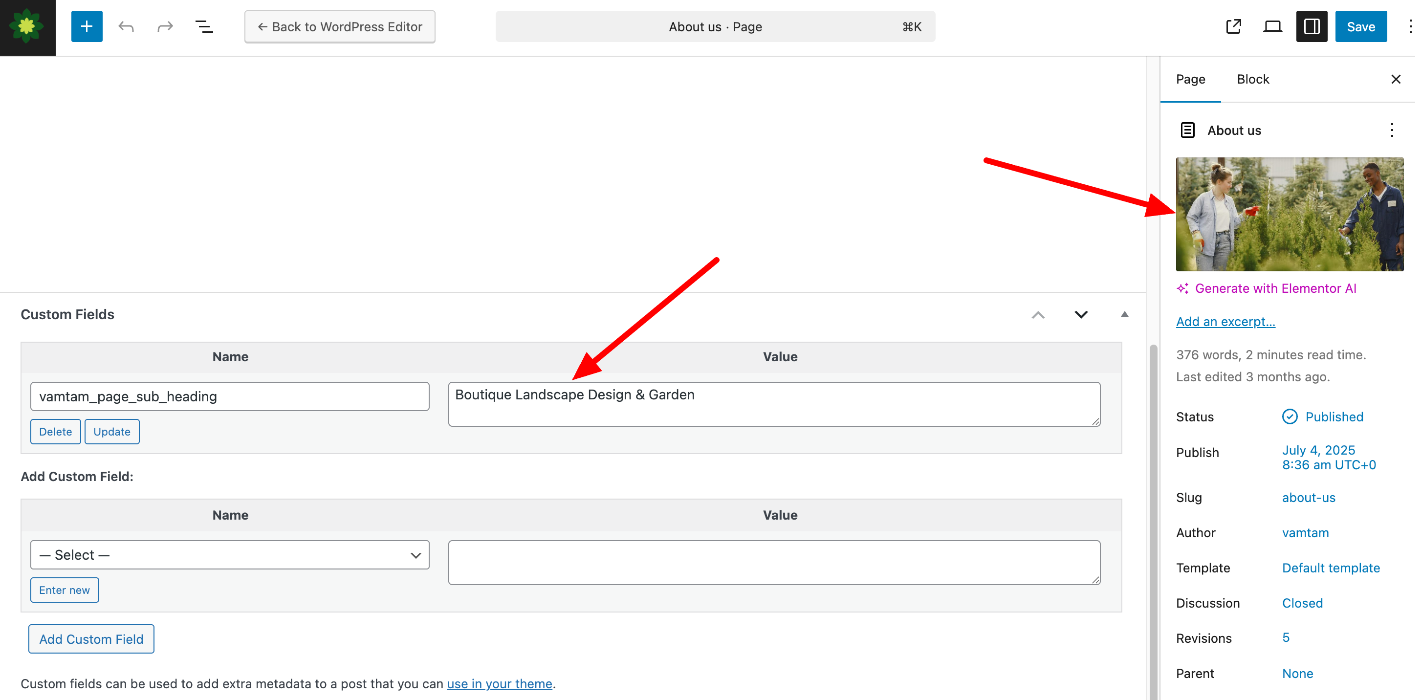 Click on "Edit" to customize the page's title, featured image, and custom field: