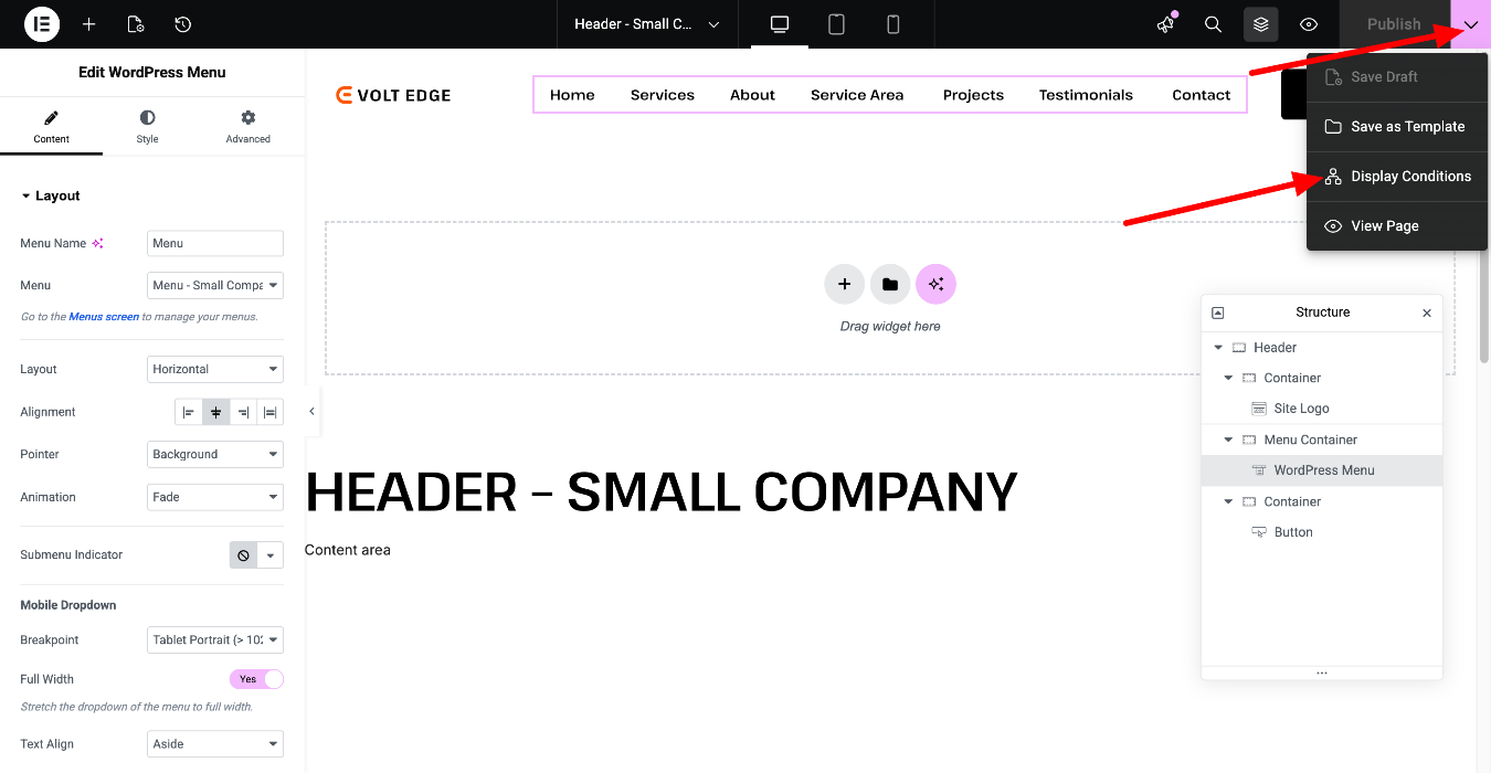 Or go to Templates > Theme Builder > Header > Header (the name of the template may be different) > Edit with Elementor. You can control the header template's layout, conditions, rules, and styles.