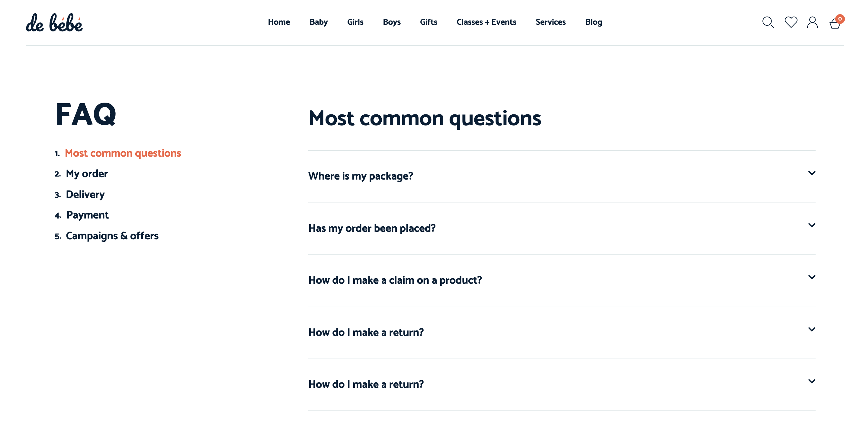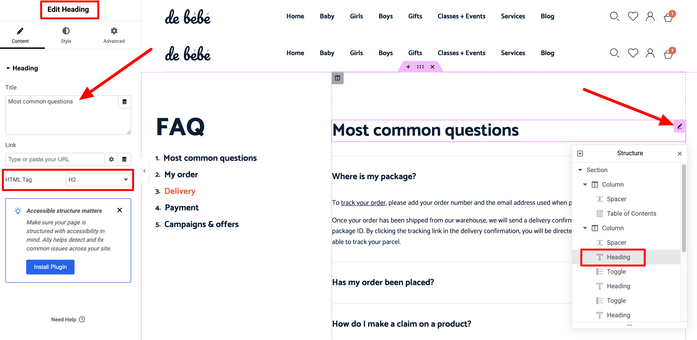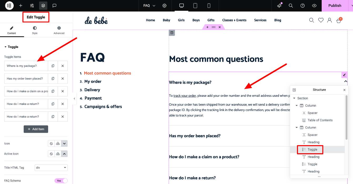 The FAQ page's been designed with the Table of contents widget (on the left), Heading, and Toggles widgets (on the right)