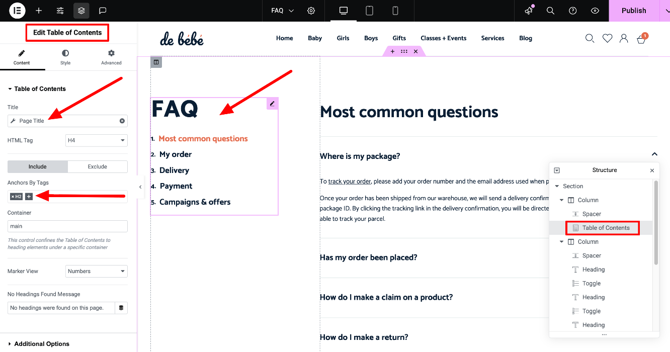 In the FAQ page of this example, the Table of contents widget gets all the Heading widgets with the HTML Tag H2