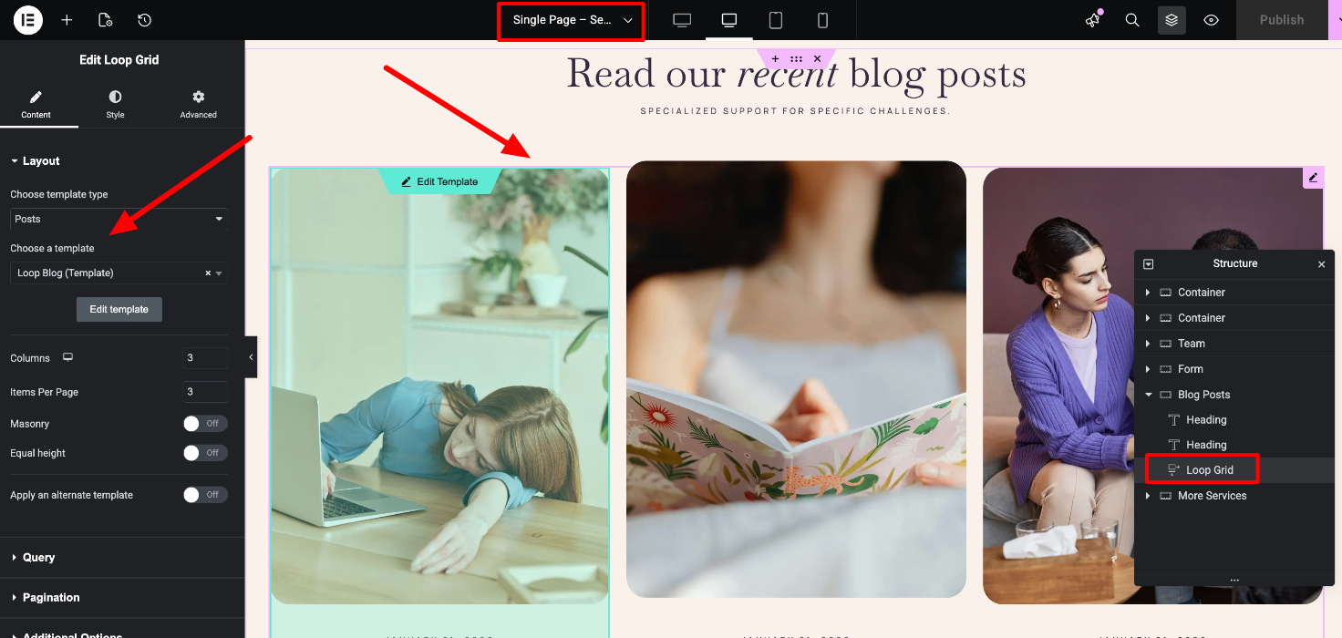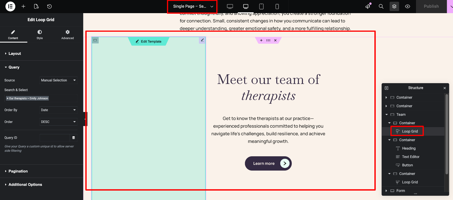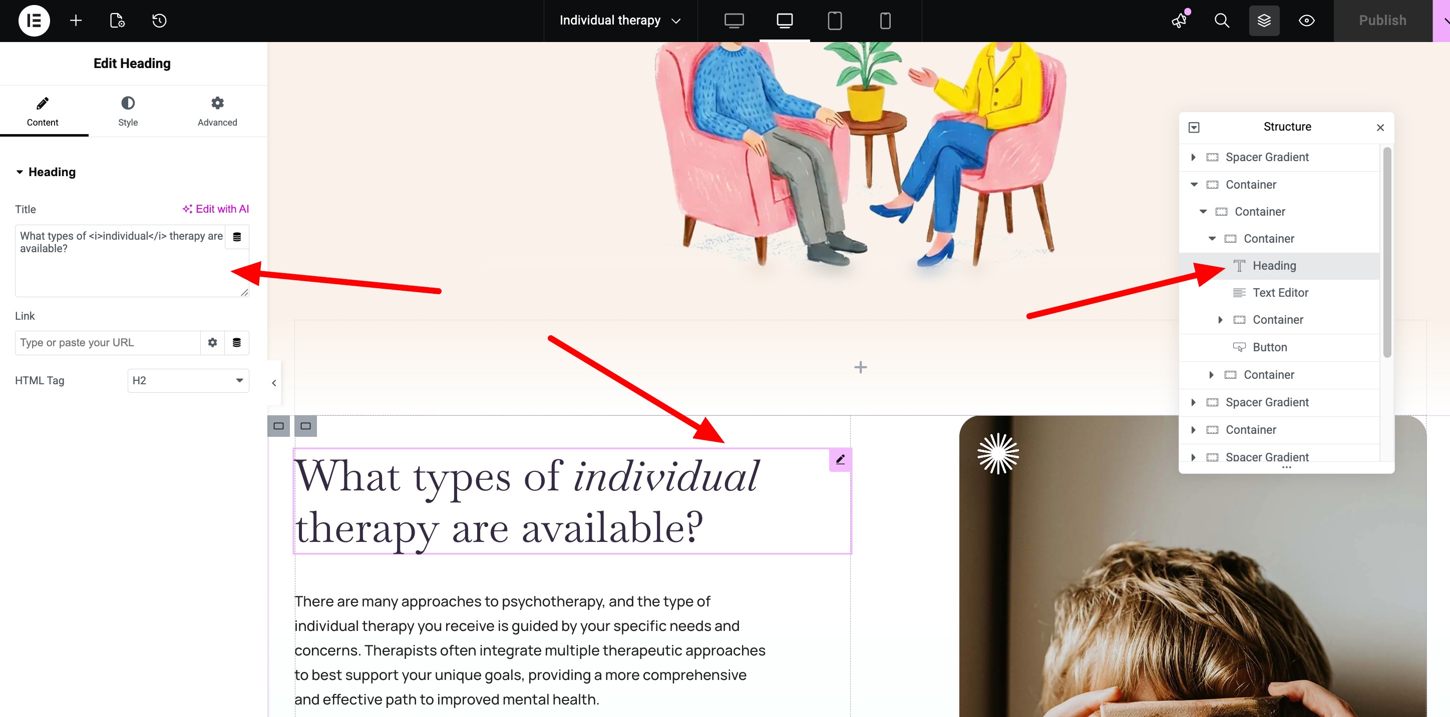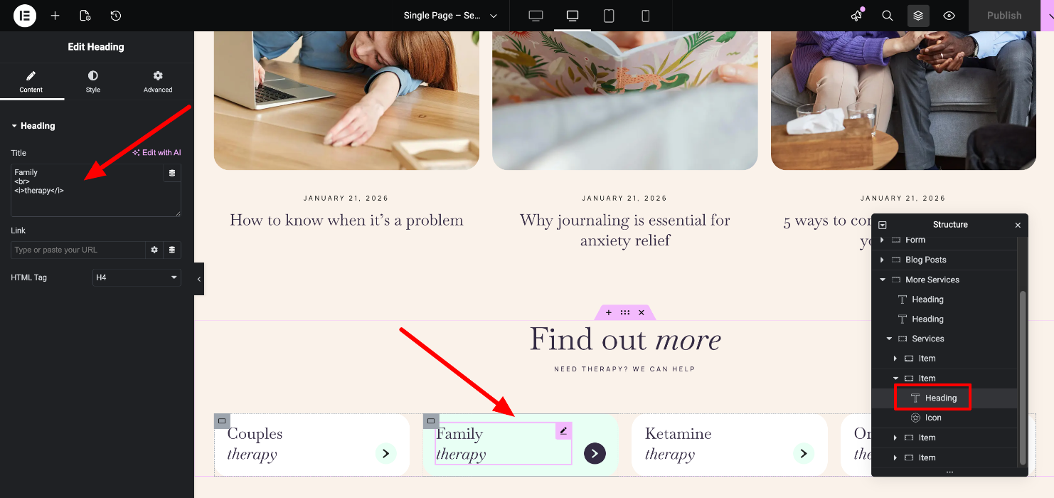 Edit the page's content easily, by locating each Elementor widget in the Navigator (The "Structure" section on the right)